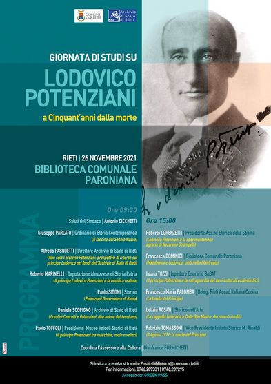 Venerdì 26 novembre, dalle ore 9.30 alle 13 e dalle 15 alle 17.30, si è tenuta presso la Biblioteca comunale paroniana di Rieti la giornata di studi in occasione dei 50 anni dalla morte del principe Lodovico Potenziani, protagonista della vita politica, economica e sociale, reatina e nazionale, nei primi decenni del Novecento.