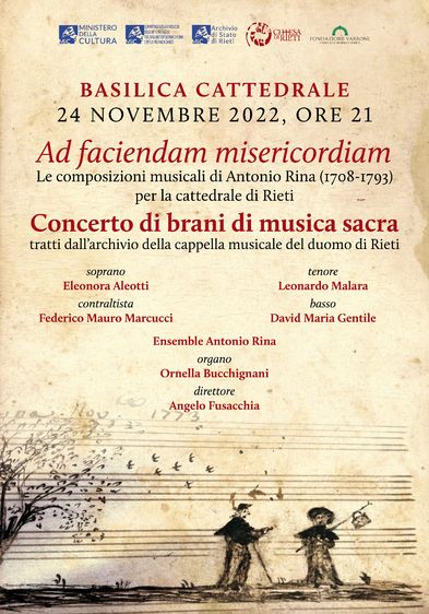 La due giorni in programma ha offerto, oltre al convegno, anche l’opportunità di scoprire il patrimonio musicale legato alla basilica cattedrale reatina con il concerto, diretto da Angelo Fusacchia, che si è svolto proprio in duomo giovedì 24 novembre alle ore 21. L’evento, intitolato Ad faciendam misericordiam. Le composizioni musicali di Antonio Rina (1708-1793) per la cattedrale di Rieti, ha visto la prima esecuzione assoluta moderna di brani di musica sacra composti appositamente per le celebrazioni in cattedrale da Antonio Rina, minore conventuale, maestro della cappella musicale del duomo dal 1726 al 1779, compositore capace di rielaborare la solida formazione contrappuntistica ‘romana’ e le influenze melodiche e formali della scuola napoletana in un linguaggio musicale di altissimo profilo. Un focus monografico sull’autore settecentesco che ha fornito un saggio del livello della produzione musicale fiorita in cattedrale e un ulteriore tassello nel percorso di riscoperta delle tante “gemme” musicali custodite nell’archivio della cappella musicale reatina.