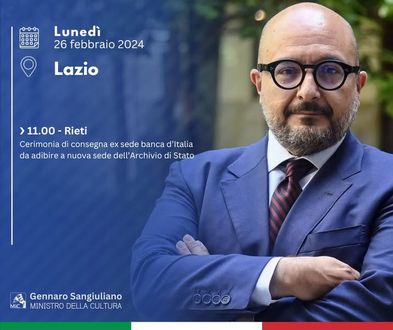 Il 26 febbraio, nel foyer del Teatro Flavio Vespasiano di Rieti, è avvenuta la firma del protocollo tra la Direzione generale Archivi del MiC e l'Agenzia del Demanio, alla presenza del ministro della Cultura, Gennaro Sangiuliano, del direttore generale Archivi, Antonio Tarasco, del direttore dell’Agenzia del Demanio, Alessandra dal Verme, del sindaco di Rieti, Daniele Sinibaldi e del direttore dell’Archivio di Stato di Rieti, Alfredo Pasquetti.