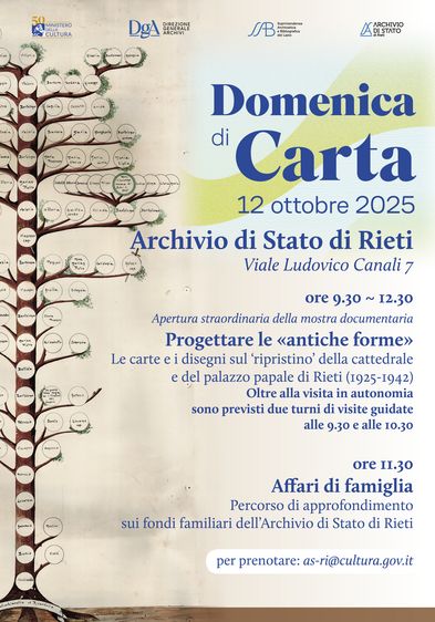 Il 12 ottobre 2025 nuova apertura straordinaria per l’Archivio di Stato di Rieti in occasione della Domenica di carta, l’appuntamento annuale che vede protagonisti gli istituti archivistici e bibliotecari del MiC, impegnati a valorizzare il loro patrimonio attraverso eventi culturali, esposizioni e attività di carattere divulgativo. Questo il programma del nostro Istituto per l’edizione 2025.