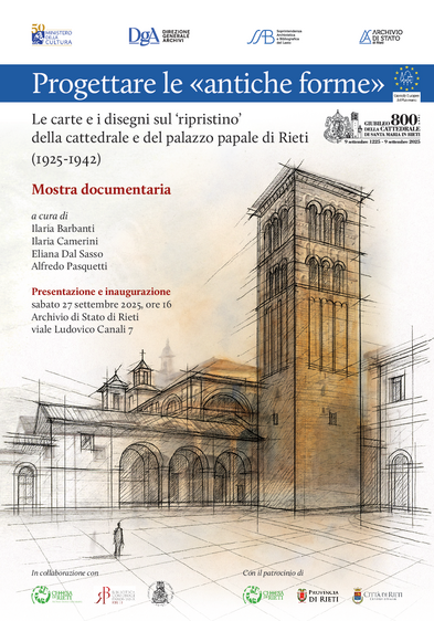 Nel consueto appuntamento con le Giornate europee del patrimonio - GEP, sabato 27 settembre 2025, alle ore 16, presso la sede di viale Ludovico Canali 7, è stata inaugurata la mostra documentaria Progettare le «antiche forme». Le carte e i disegni sul ‘ripristino’ della cattedrale e del palazzo papale di Rieti (1925-1942), a cura di Ilaria Barbanti, Ilaria Camerini, Eliana Dal Sasso e Alfredo Pasquetti.