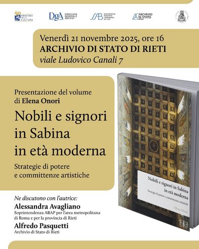 Venerdì 21 novembre alle ore 16, presso la sede dell’Archivio di Stato di Rieti in viale Ludovico Canali 7, si è tenuta la presentazione del volume di Elena Onori, Nobili e signori in Sabina in età moderna. Strategie di potere e committenze artistiche (Monte Compatri, Edizioni Espera, 2025). L’iniziativa (qui la locandina) è stata organizzata in collaborazione con l’Associazione storica per la Sabina.