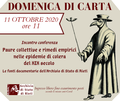 In occasione della Domenica di carta evento promosso dal MiBACT per l’apertura straordinaria degli archivi in modo da avvicinare i cittadini al ricco patrimonio documentale conservato, l'Archivio di Stato di Rieti ha organizzato l'incontro-conferenza dal titolo Paure collettive e rimedi empirici nelle epidemie di colera del XIX secolo. Le fonti documentarie dell'Archivio di Stato di Rieti.
