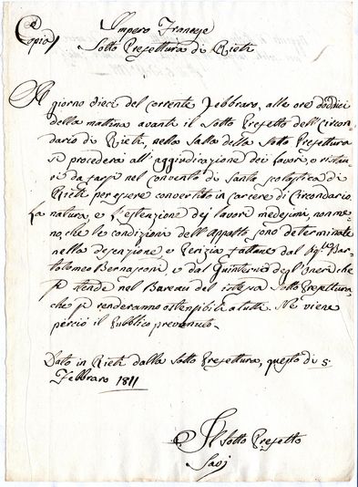 Per ricostruire questo periodo, si possono utilmente consultare anzitutto l'archivio della Sottoprefettura di Rieti (impero francese, 1809-1814), che raccoglie la documentazione dell'ufficio titolare di una giurisdizione che giungeva fino al Tevere, e poi alcuni fondi giunti all'Archivio di Stato di Rieti all'interno dell'archivio del Tribunale: la Giudicatura di pace di Rieti (1809-1812), il Tribunale di prima istanza di Rieti (1809-1814), i Giudicati circondariali di Amatrice, di Antrodoco, di Borbona, di Cittaducale e di Leonessa, i cui atti civili e criminali sono relativi, per tutti i centri, agli anni 1811-1814.